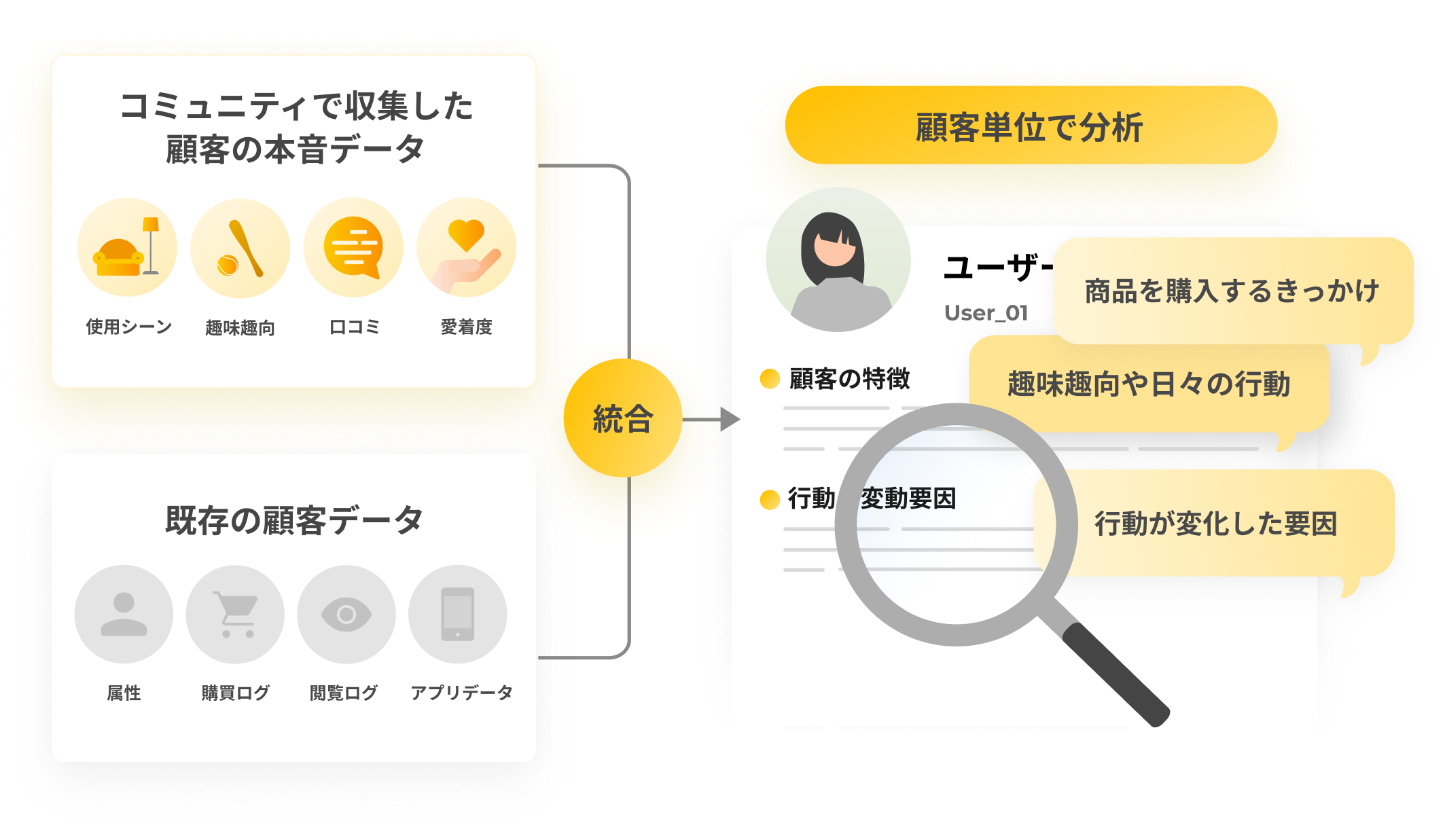 や購入理由を自社顧客の声から把握可能。
