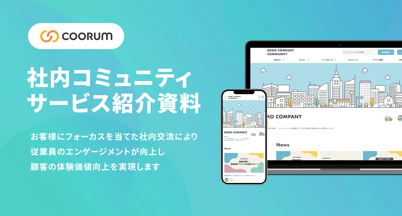 coorum サービス紹介資料ダウンロード詳細について、左のフォームよりお問い合わせよろしくお願いします。フォーム送信後、2営業日以内を目安にご連絡させていただきます。coorumについてご興味を持っていただきありがとうございます!組織エンゲージメント向上につながる施策を知りたい社内向けのこミュニティ施策が知りたいなど、気になる点やご不明な点があればなんでもお問い合わせください!1-2営業日以内に弊社の担当から連絡をさせていただきます。下記フォームにご記入後、送信ボタンを押して下さい。